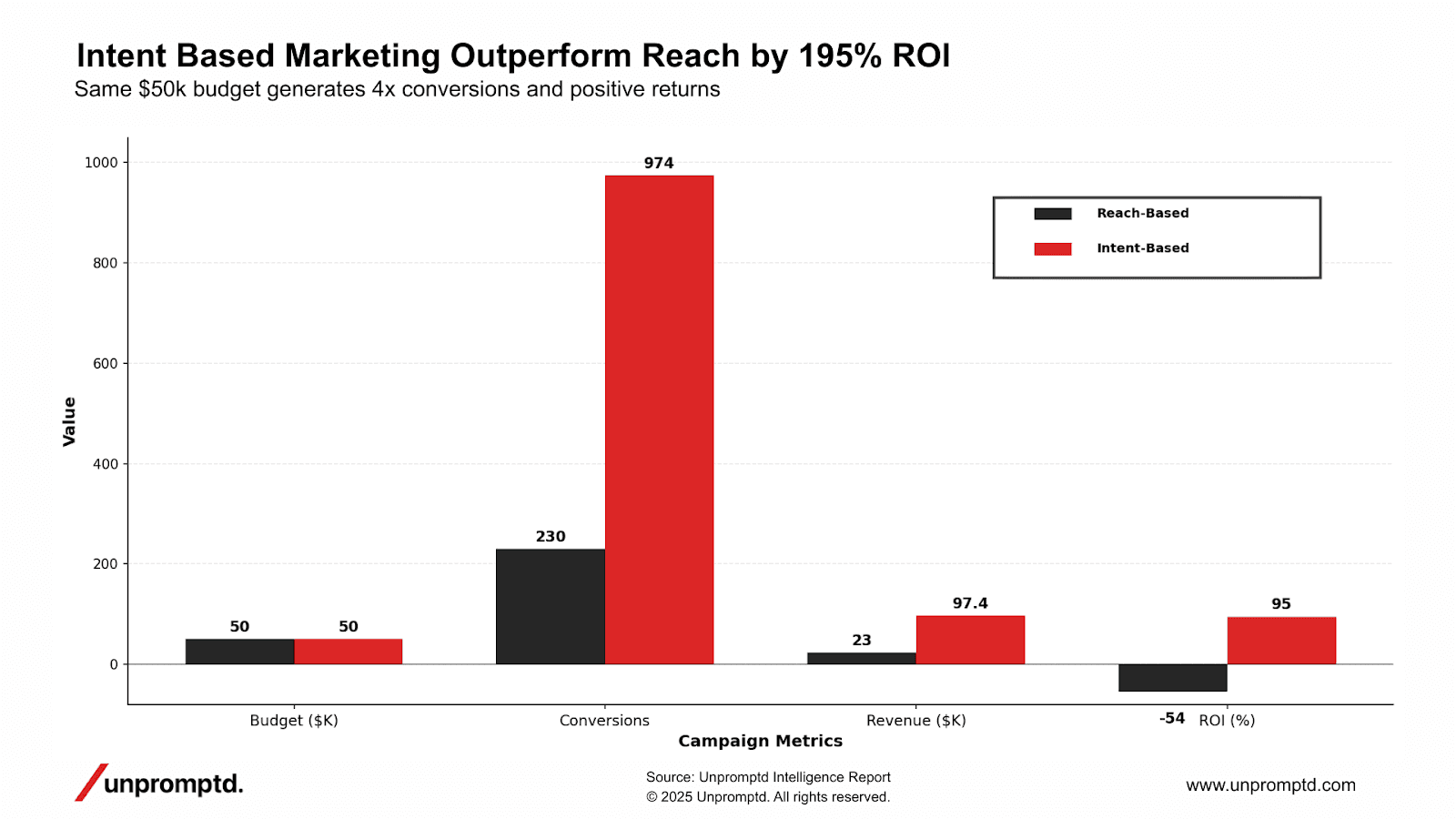 With the same $50,000 budget, reach-based display produces far fewer conversions, weaker revenue, and negative ROI. Intent-based multi-channel campaigns, on the other hand, generate significantly higher conversion volume and deliver positive returns.